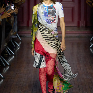 Établie depuis 2017, la marque Marine Serre, dirigée par la fondatrice portant le nom, nous a eblouie par la fraicheur et la candeur sa collection. Celle-ci intitulée Heartbeat se veut venant du coeur. Le denim était au coeur de plusieurs tenues et la presence des couleurs vives tels que le rose fushcia, le turquoise et le orange rendaient merveilleusement sur les tenues. La maison n’a pas hésité à y aller fort avec les motifs et les images sur les tenues qui encore une fois nous rappelait que c'était une collection d’été bien chaude!