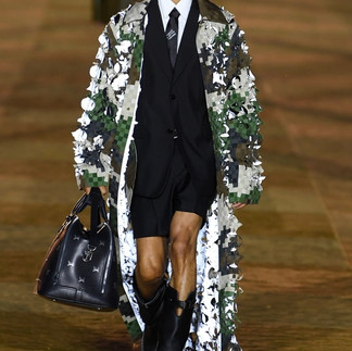 Au début de l’année , en fevrier, la marque annoncait que l'artiste Pharell allait prendre les rênes de la direction artistique pour la section homme de Louis Vuitton, position non occupée depuis le décès de Virgil Abloh en 2021. De grands souliers à remplir, Pharell a déployé tout son expertise pour prouver qu'il avait sa place à la tête de la maison. Le 'chic décontracté' semblait être être les mots d'ordre. La collection était un melange équilibré entre la nouveauté, entre autre par la presence d'un motif militaire pixelisé à la Minecraft, mais en gardant les motifs qu'on connait de Louis Vuitton dont le fameux motif de dames.